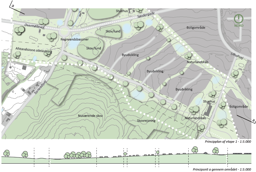 Planen tager udgangspunkt i de eksisterende grønne strukturer, de mange vandløb, de levende hegn og de varierede terræn. Disse kvaliteter skal udvides og gøres tilgængelige, til gavn for biodiversiteten og rekreation. Kvartererne udvikles som øer i et naturlandskab. Dyrkede marker omdannes til et attraktivt grønt og blåt naturlandskab, som omkranser nye og attraktive boliger.