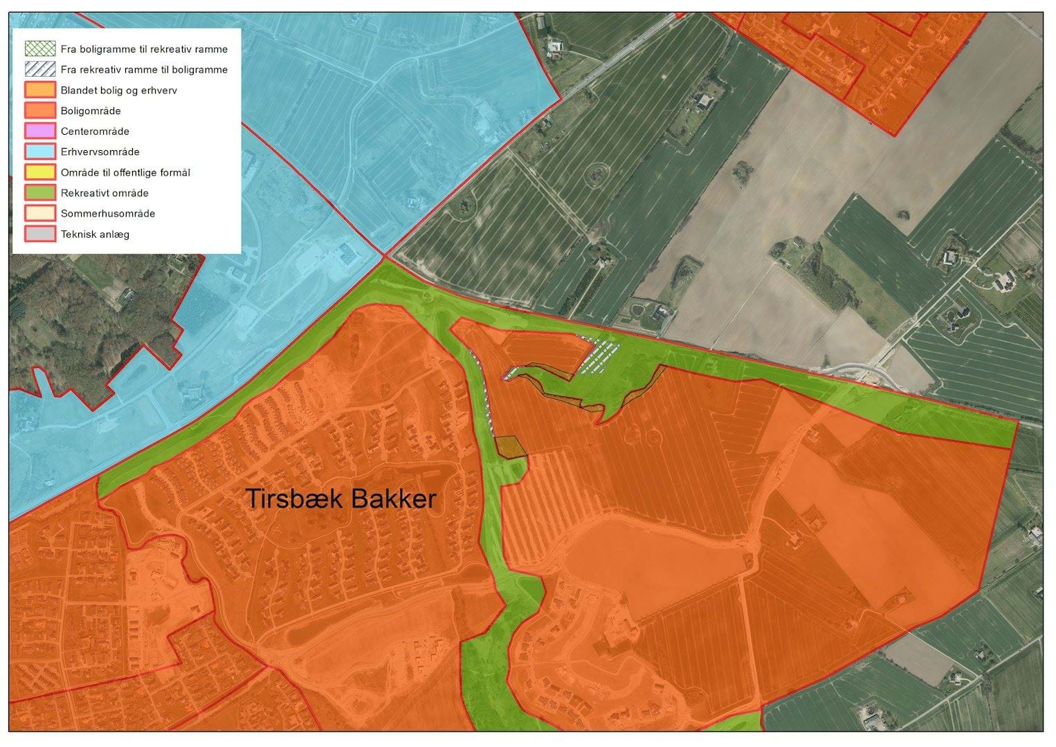 I forbindelse med udbygningen af Tirsbæk Bakker har Vejle Kommune modtaget et forslag om at lave en ombytning af arealer til boligformål og rekreative formål. Kommuneplanrammerne for 1.6.B.16 og 1.6.R.4 er derfor ændret som det fremgår af kortet.