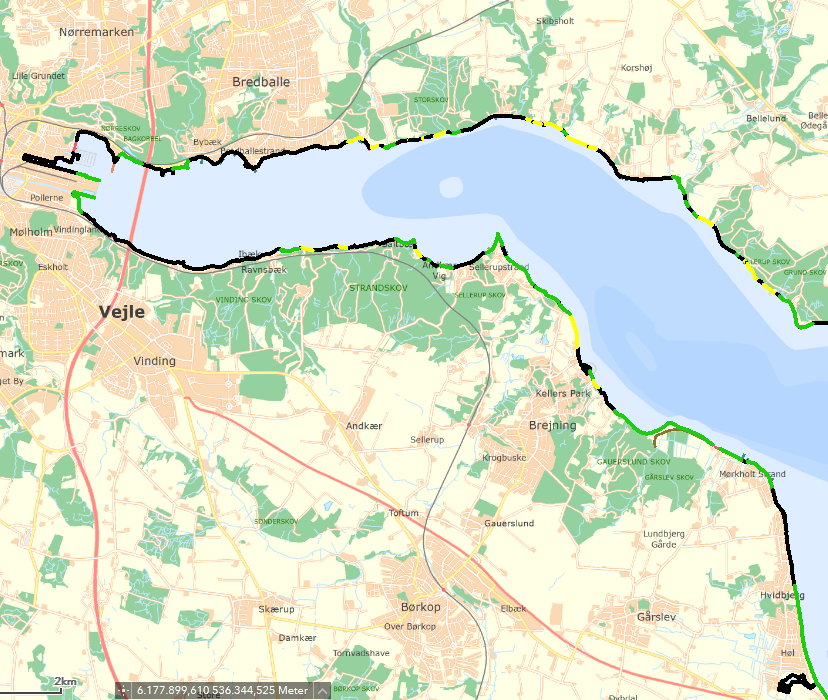Jf Kystatlas findes der tre kategorier ved kysterne i Vejle Kommune. Fremrykning, lille erosion og moderat erosion. Når dette sammenholdes med luftfotos og kystlinjen fra 2015, ses der ikke tegn på tilbagerykning af kystlinjen i væsentligt omfang.