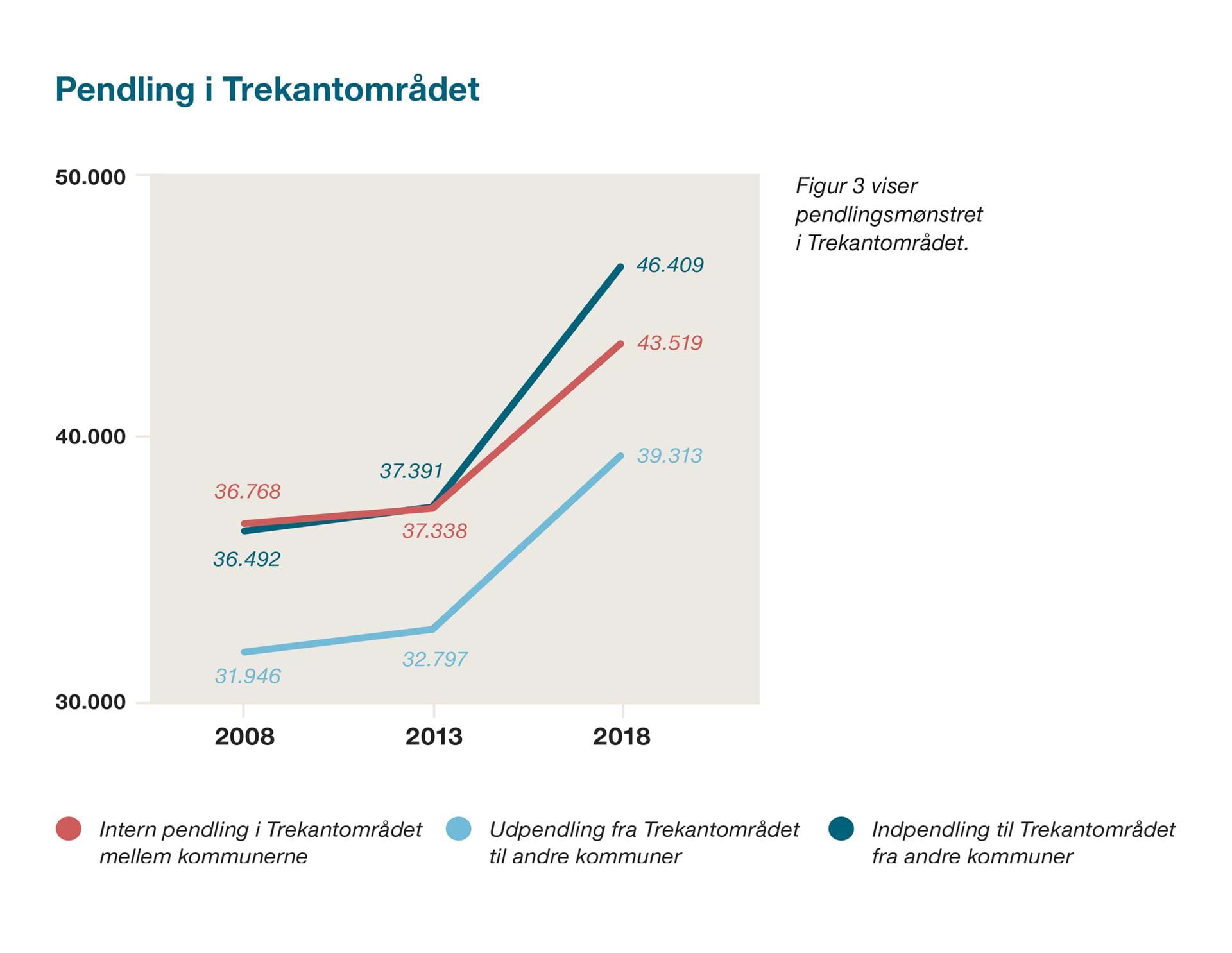 Grafen viser, at pendlingen er stadigt stigende i Trekantområdet, og det uanset om der er tale om intern pendling mellem kommunerne i Trekantområdet eller ind- og udpendling til/fra Trekantområdet.